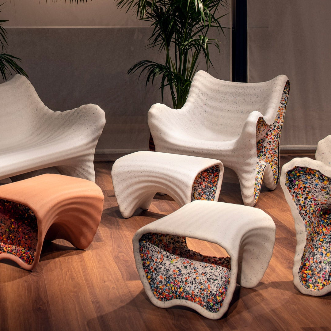 Thomas Heatherwick explains: ''In a world grappling with the consequences of plastic pollution, the idea behind this new collection is to use waste materials and reveal their inner beauty in unexpected ways. Recycling doesn't have to be less beautiful, it can enable the emergence of joyful, energetic forms.''