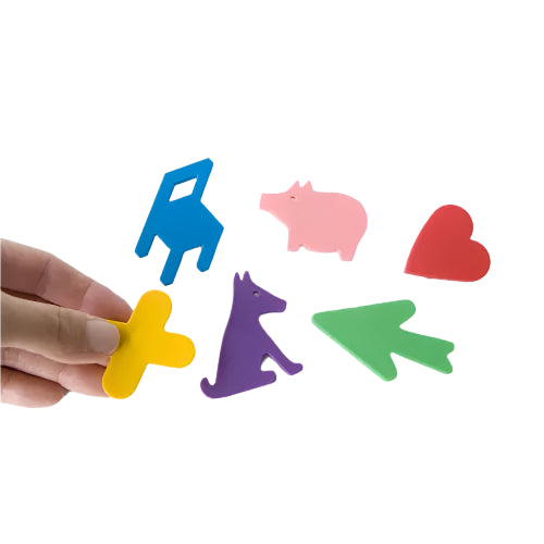 In ABS, including hidden magnets (red heart, green arrow, violet dog, pink piglet, blue chair, yellow “X”).