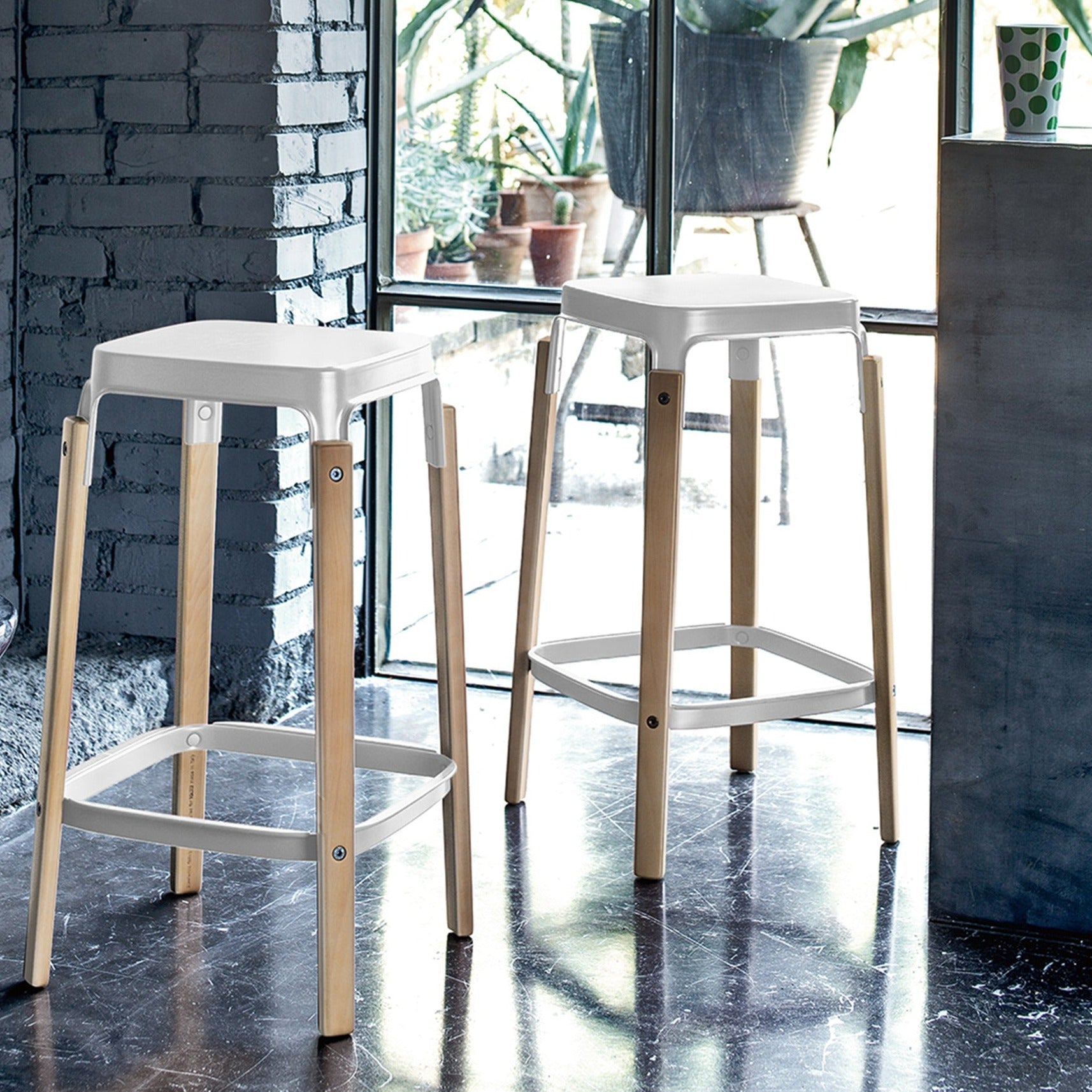 Material: seat and footrest in steel plate painted in polyester powder. Legs in solid beech (natural or painted), or in solid American walnut or in solid oak (natural or painted).