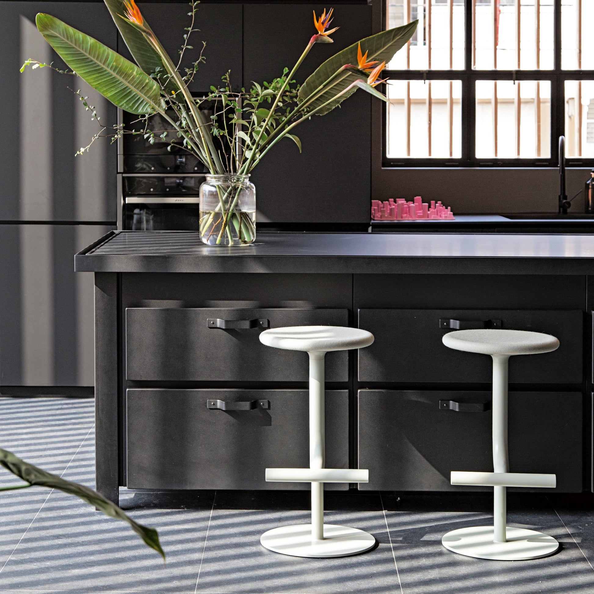 The Tibu stool by Magis is height adjustable between 60 and 77 cm and it is therewith suitable to be used at tables and counters of different heights. The seat can also be ordered with a fabric cover, which is adapted to the colour of the base and which suits the design of Andersen & Voll uniformly.