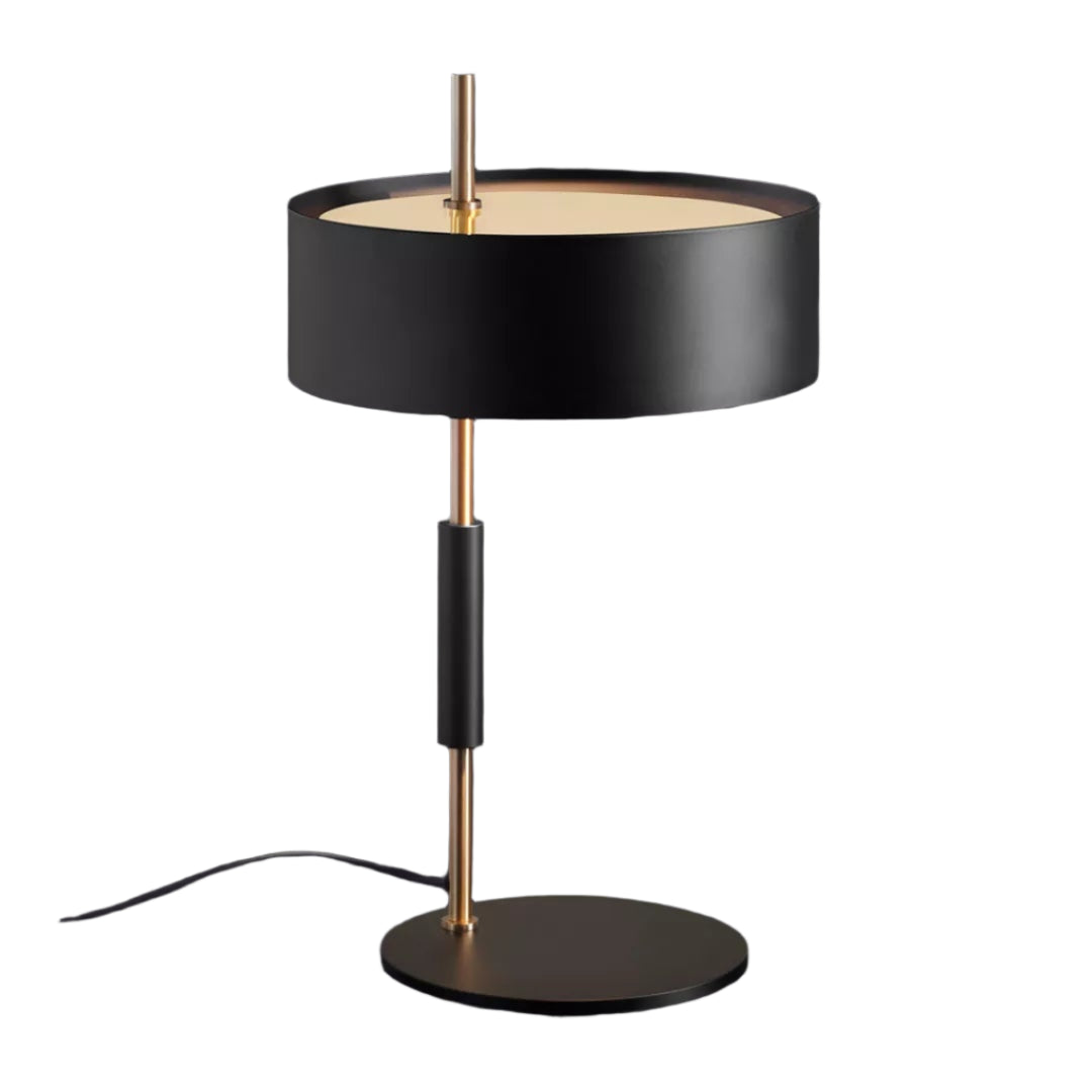 The lamp 1953 designed, by Ostuni e Forti, has two models, floor and table, varying in proportion and size but identical in their design which shifts the whole lampshade section from the centre to the side. A range that elegantly recalls the style of those years, such as the use of a shade in the classic cylindrical shape and the fine contrast of the satin gold – stem and shade’s interior – against the black – the exterior of the shade, the base and the stem grip