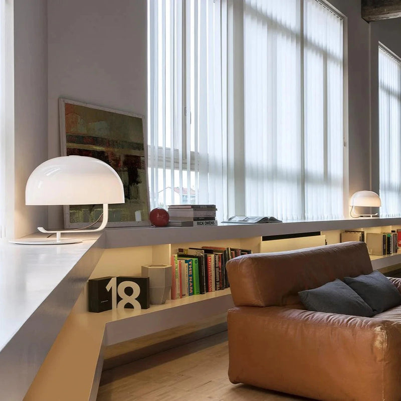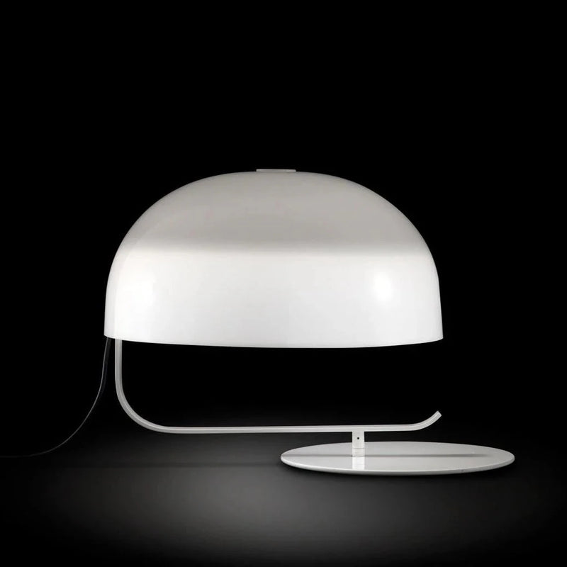 Constructed from an white opal thermo-plastic dome shade and curved support and metal base available in nut brown or white.