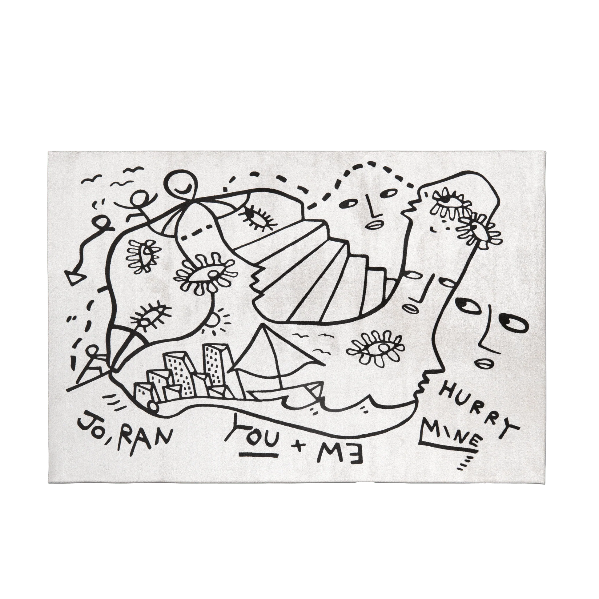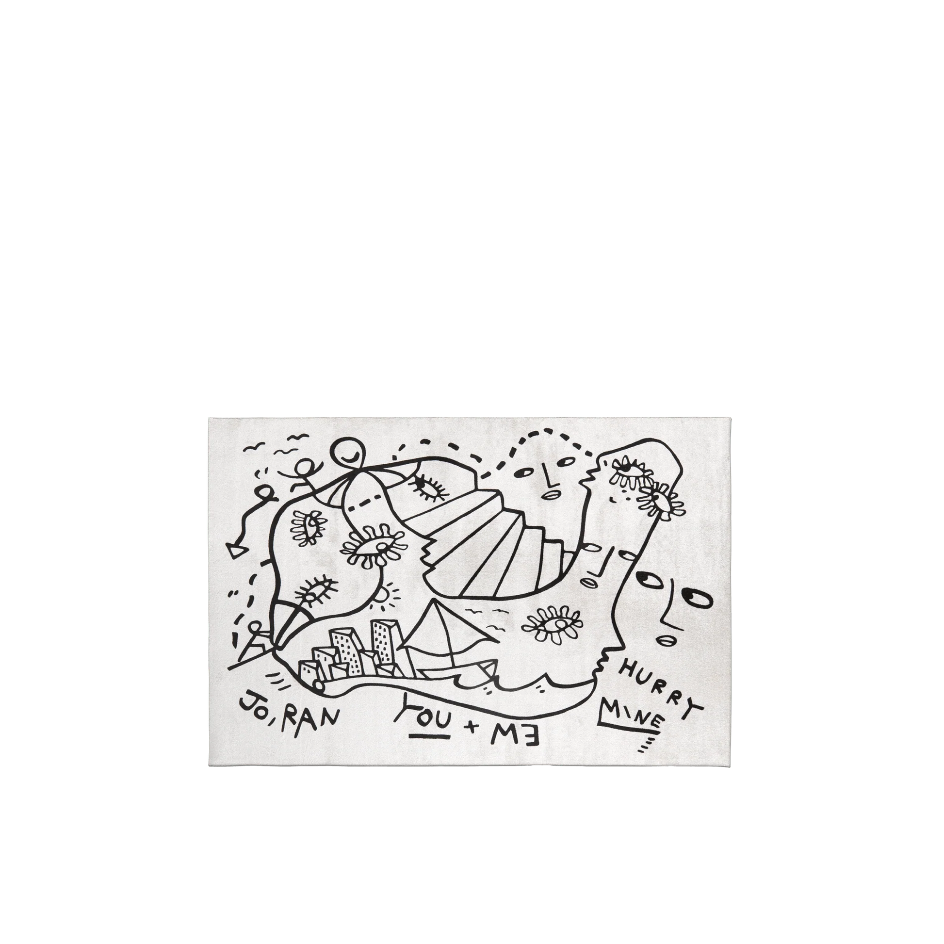 Dream Dimension collection includes a series of poufs, cushions and carpets all characterized by lines, texts and stylized drawings in black and white, a recurring language that Shantell uses in her artwork.