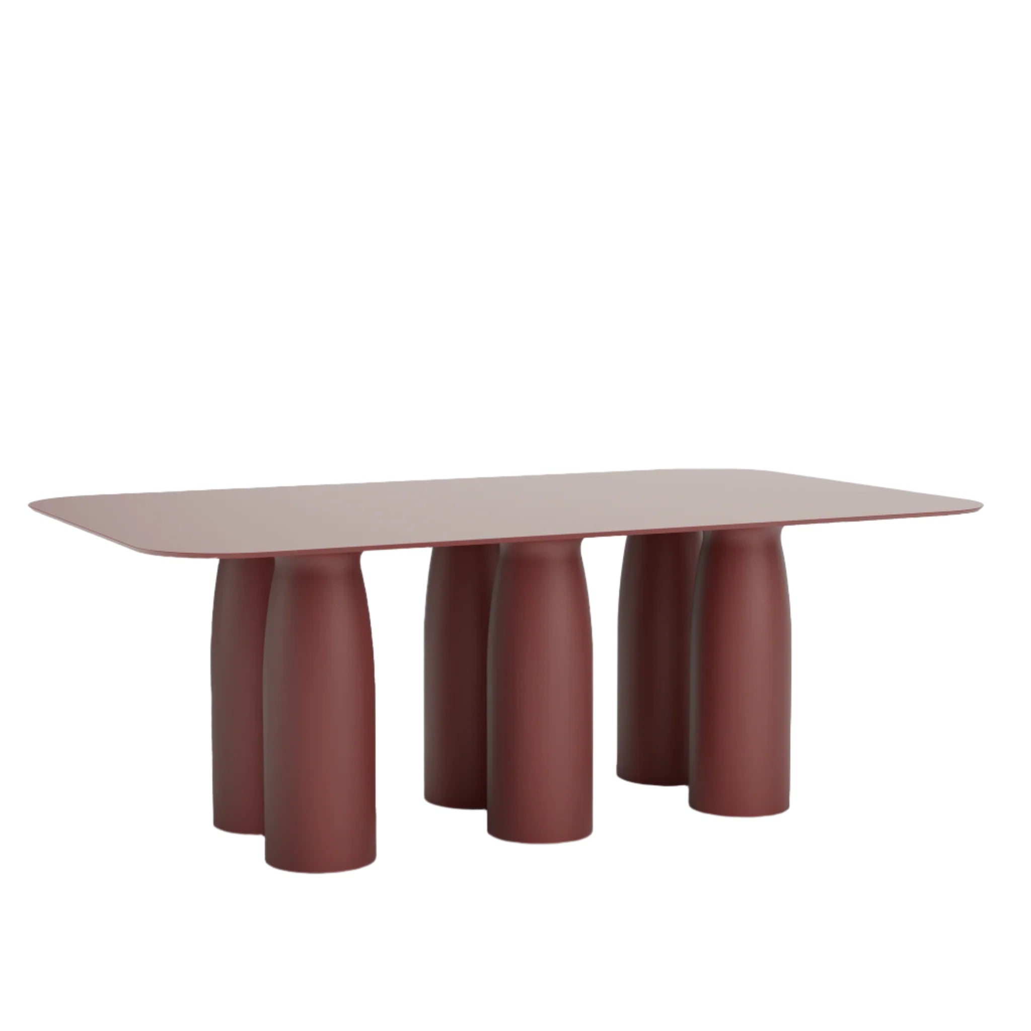 Discover the rectangular table (200 x 120 cm) with HPL top, supported by six pillar bases in recyclable polyethylene.
