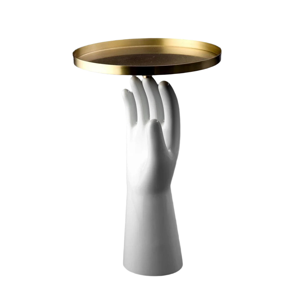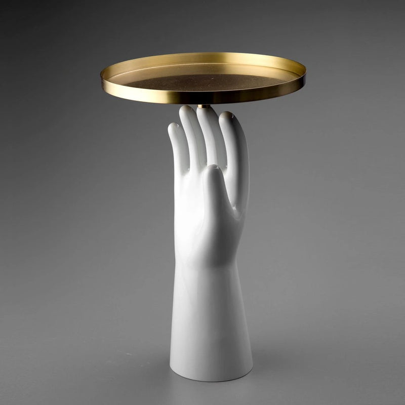 Hände Hoch or hands up is a collection of used domestic objects, candlesticks, a dressing mirror, a tray, which continues with a series of table and wall lights. Here, porcelain hands on a ring finger juggle the tray or adjust the mirror; in the case of the candlestick, the owner can define the message by the number of candles. The collection refers to the aesthetics of the vanished world of clowns and eskamoters from the circus environment of František Tichý's paintings.