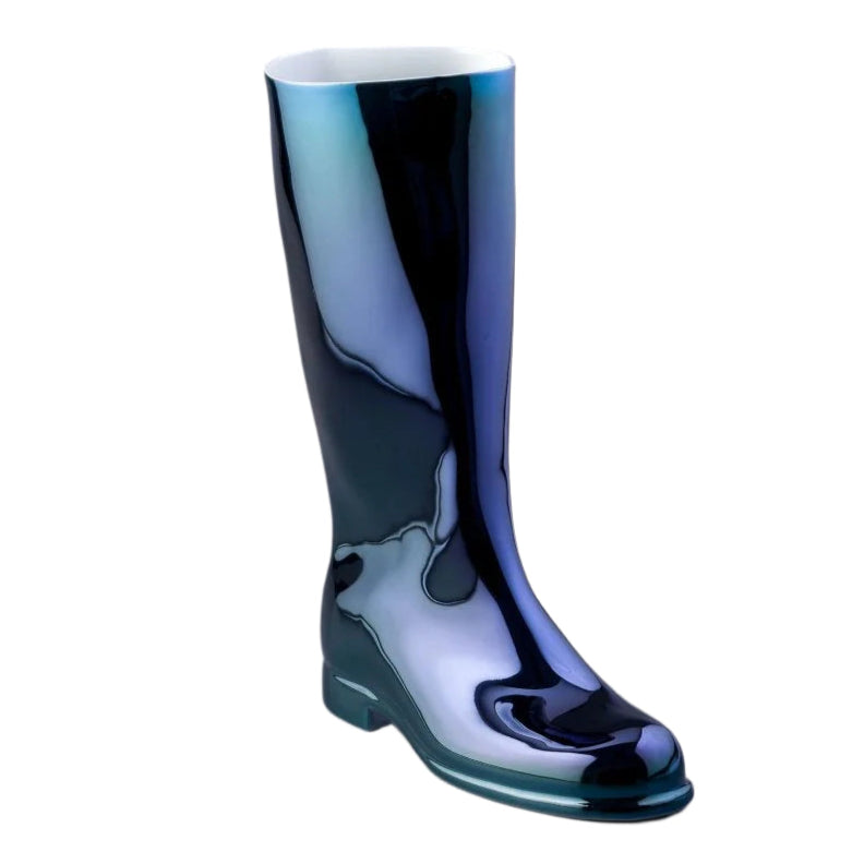 Rubber boot shaped vase, originally white, later expanded in many colour variations, starting with onion decoration and other, mainly plated variations. Part of a thesis with one of the most famous Maxima products. The author's fascination with folkiness, practical aesthetics and trivial charge is already evident here, as well as his desire to reverse a seemingly fatal fate and elevate an ordinary product through noble materials and a change of function.
