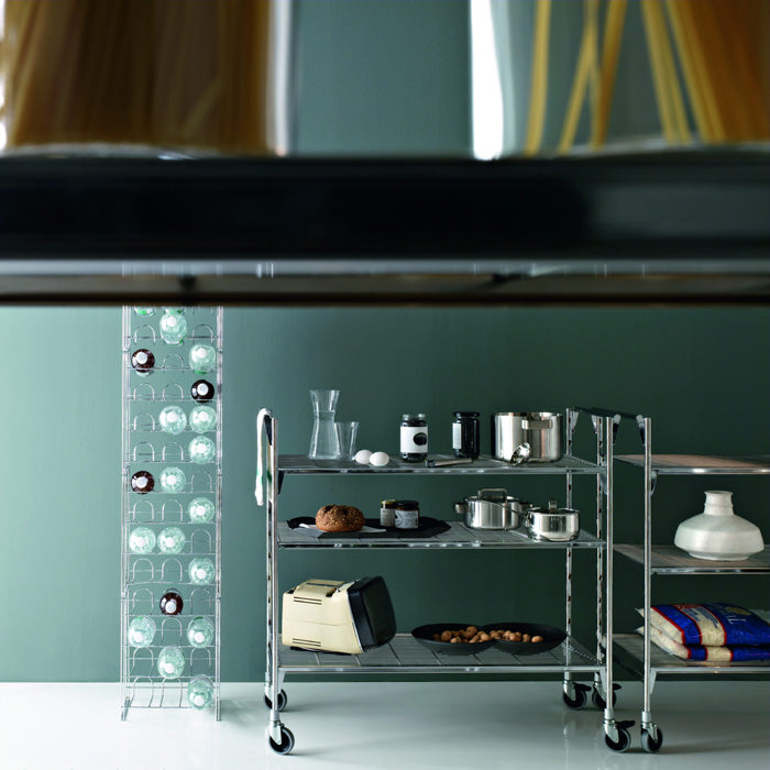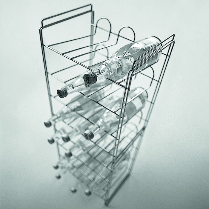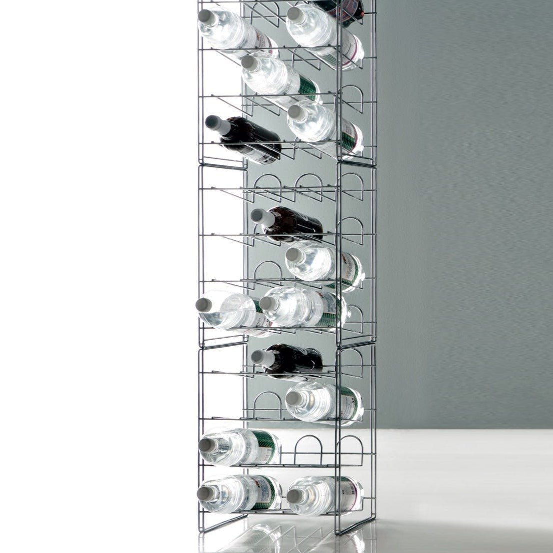Elegant chromium plated steel structure, stackable into several units, the ideal solution for storing up to 12 bottles in an easily accessible, small space.