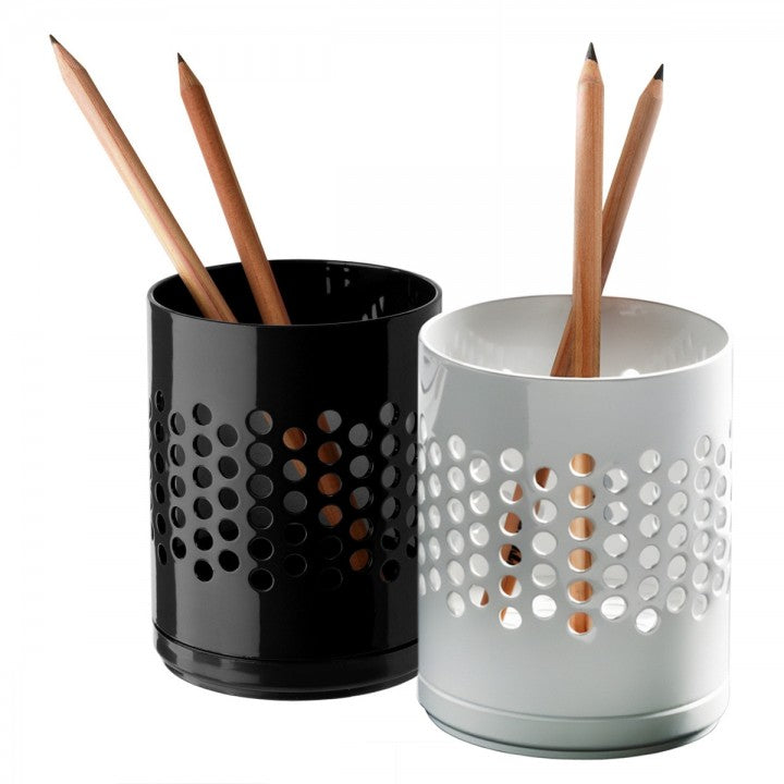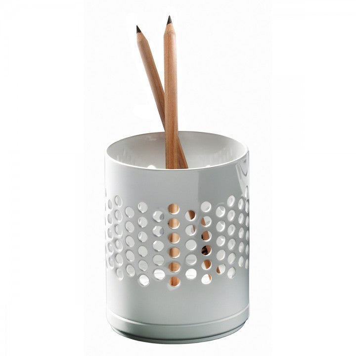 The forerunner of a successful collection of desk accessories, it holds pens and pencils with its elegant, technical perforated design, perfectly suited to both office and home.