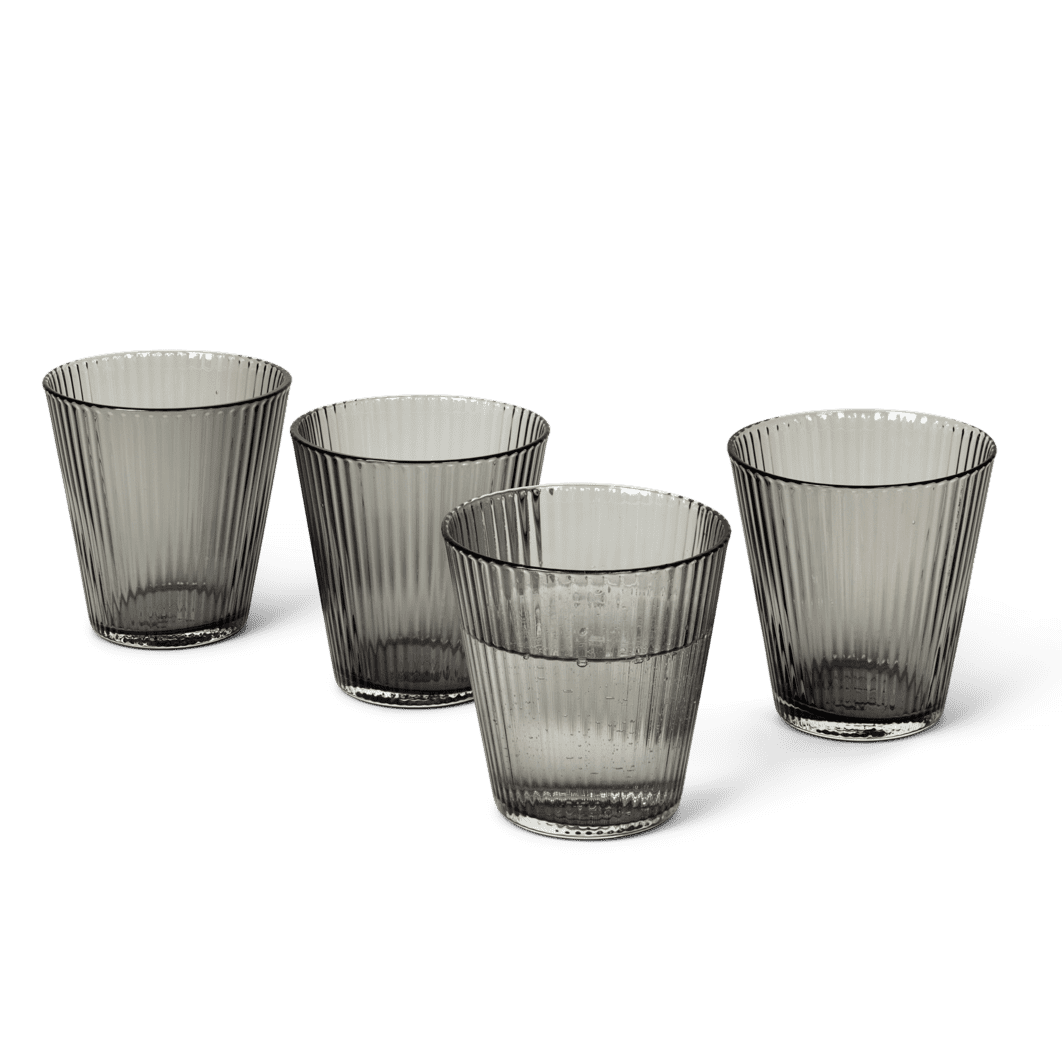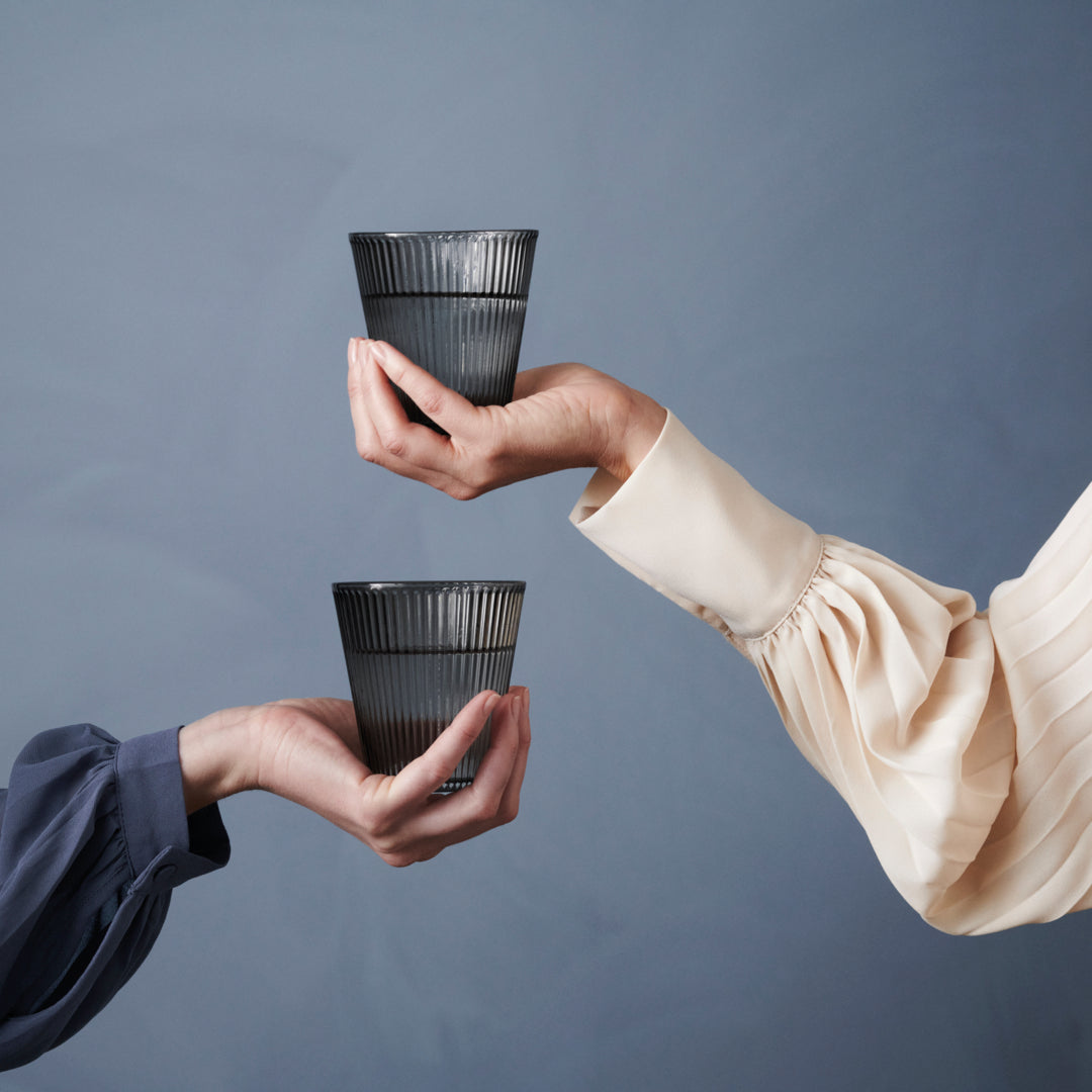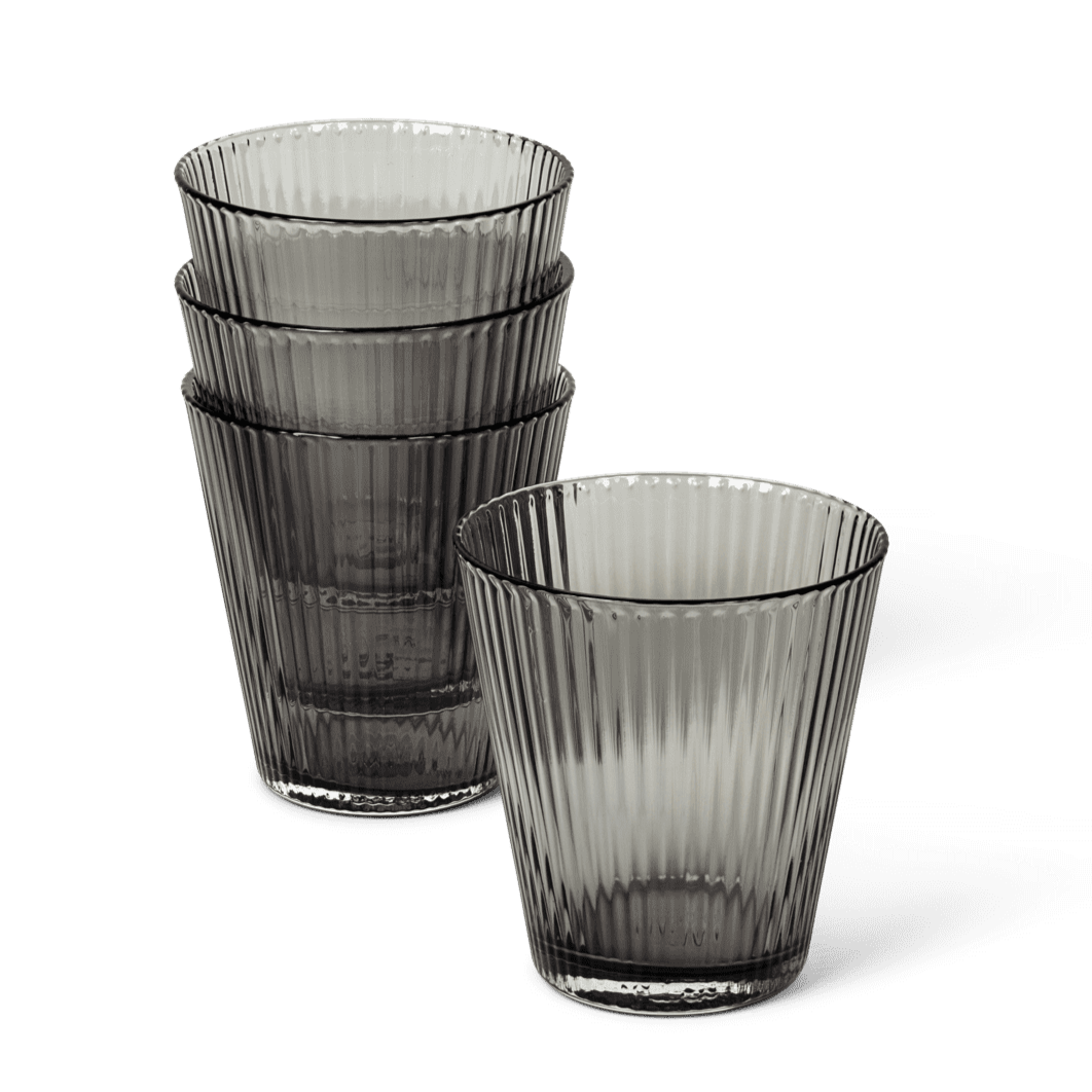 Elegant and functional glasses for everyday use, serve ice-cold refreshing water in the elegant smoke-coloured glasses. Repeating grooves adorn the surface of the glass and create a refined optical play when the light is refracted.