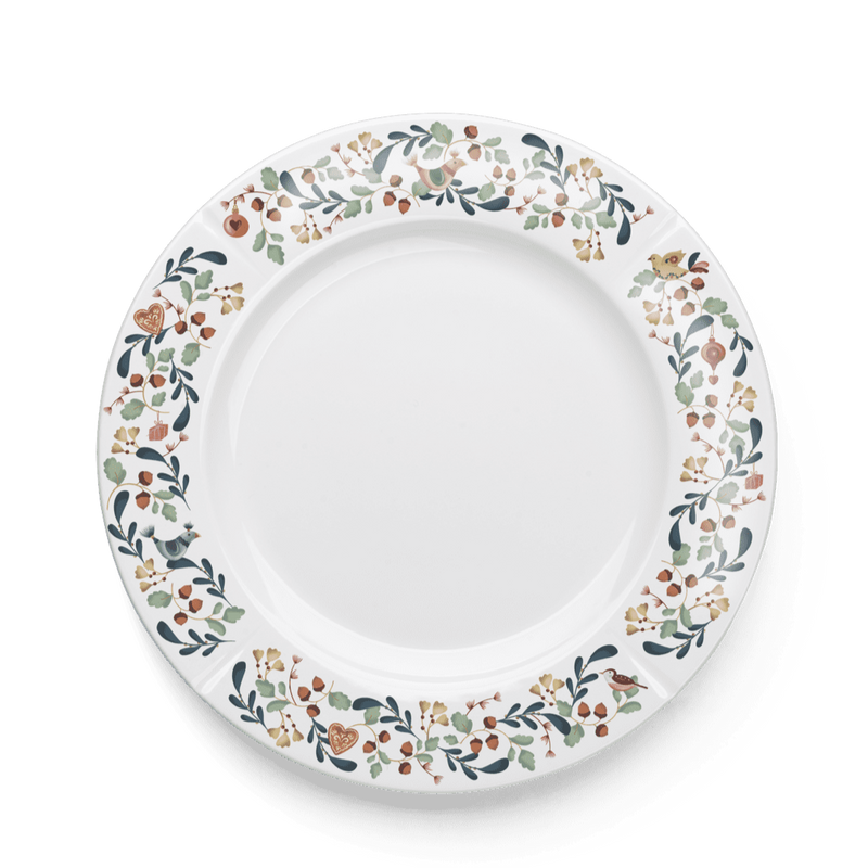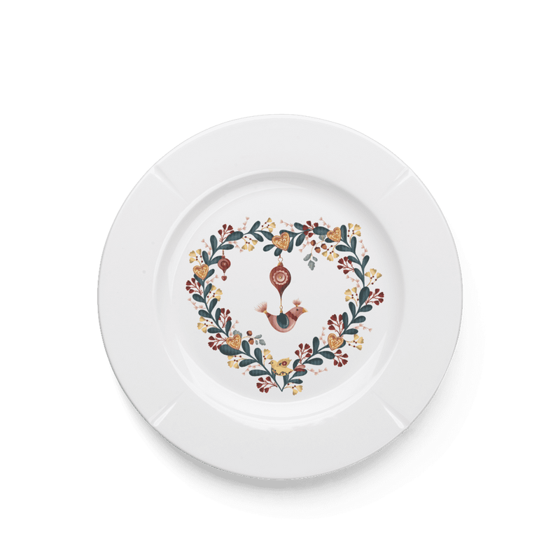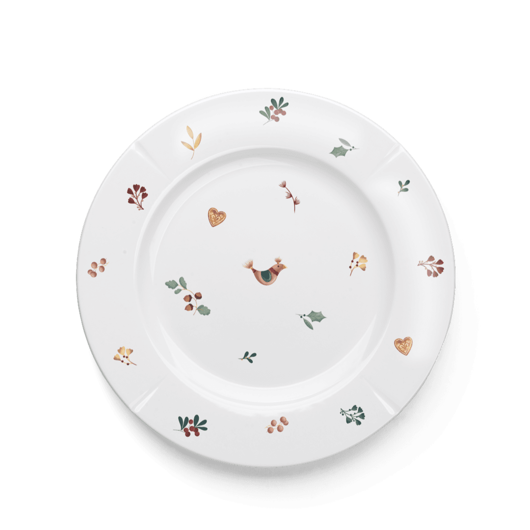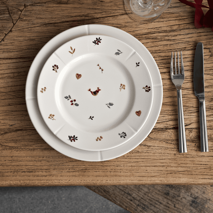 The basic elements in the Grand Cru Cottage series are leaves and branches, berries, holly, birds, gingerbread hearts, glass decorations and acorns. These are combined in a unique composition on each piece in the dinner collection. Grand Cru Cottage is like a family whose members all contain the same graphic elements in the same colour palette. This gives a feeling of harmony throughout the collection, despite each piece being different.