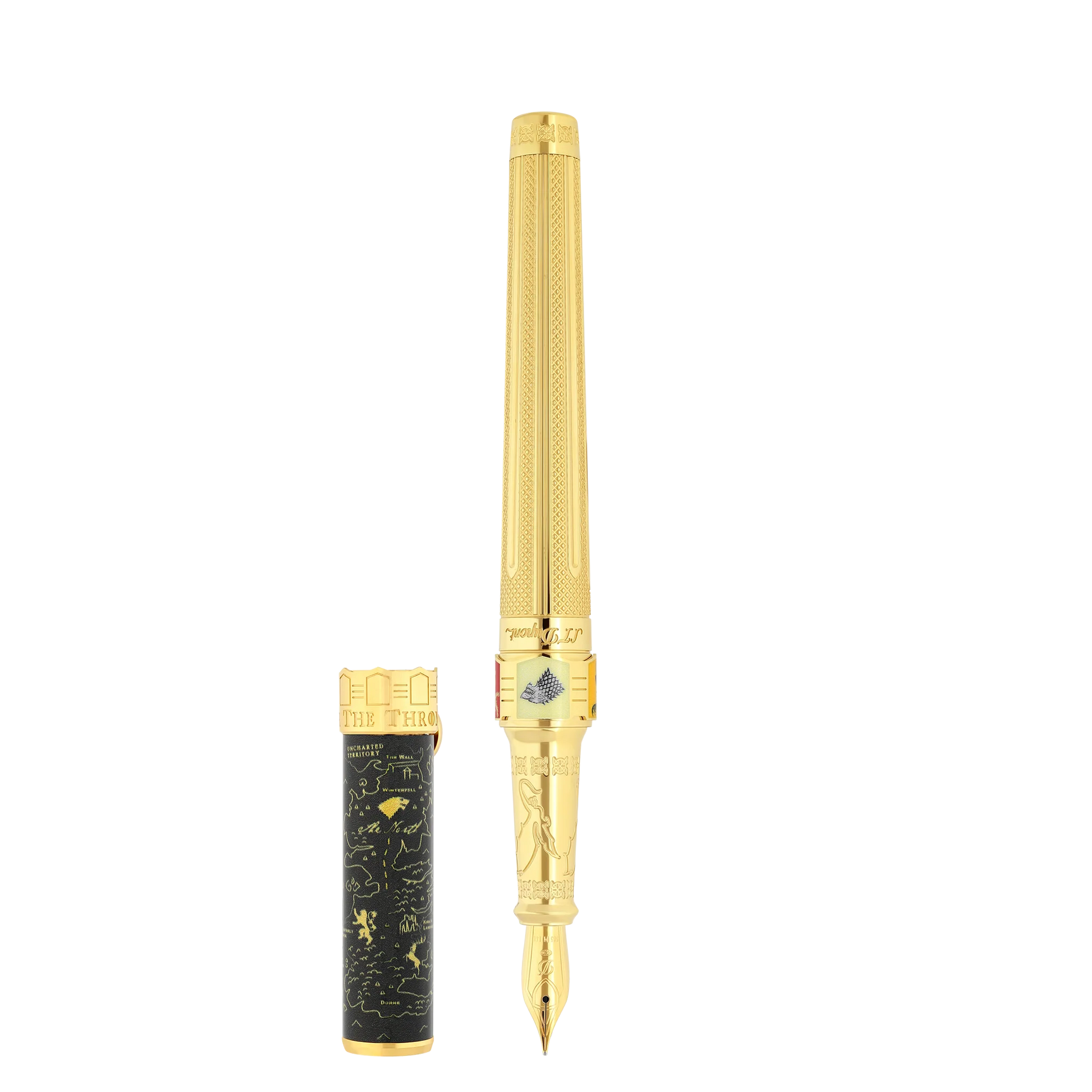 Line D Eternity XL multifunction pen featuring a rollerball and a 14-carat gold fountain pen sleeve. Includes piston mechanism. Guilloché chainmail pattern with gold finish. Cap decorated with the map of Westeros. Clip bears the King's Hand insignia. Dragons engraved on the sleeve. The set includes a Catspaw dagger letter opener and a medallion. Limited and numbered edition of 150 pieces. Associated roller refills: 040840 Blue - 040841 Black Ink cartridges: 040112 Blue - 040110 Black - 040362 Red - 040363 Green - 040364 Turquoise.