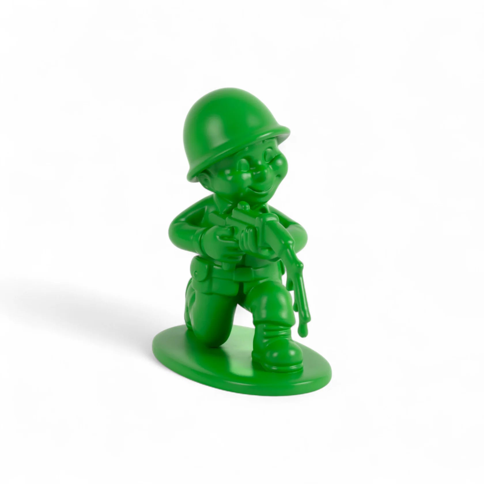This little green soldier, straight from childhood memories, kneels not to aim but to disarm. His rifle, once molded for war,now melts in his hands like wax under sunlight. No violence, no struggle. Just the quiet power of gentleness. A tribute to innocence, to the dream that even plastic can melt hate. This is the moment where war gives up and peace begins to play