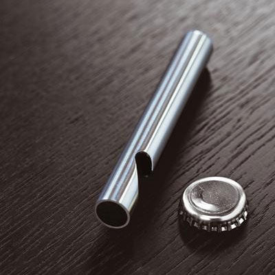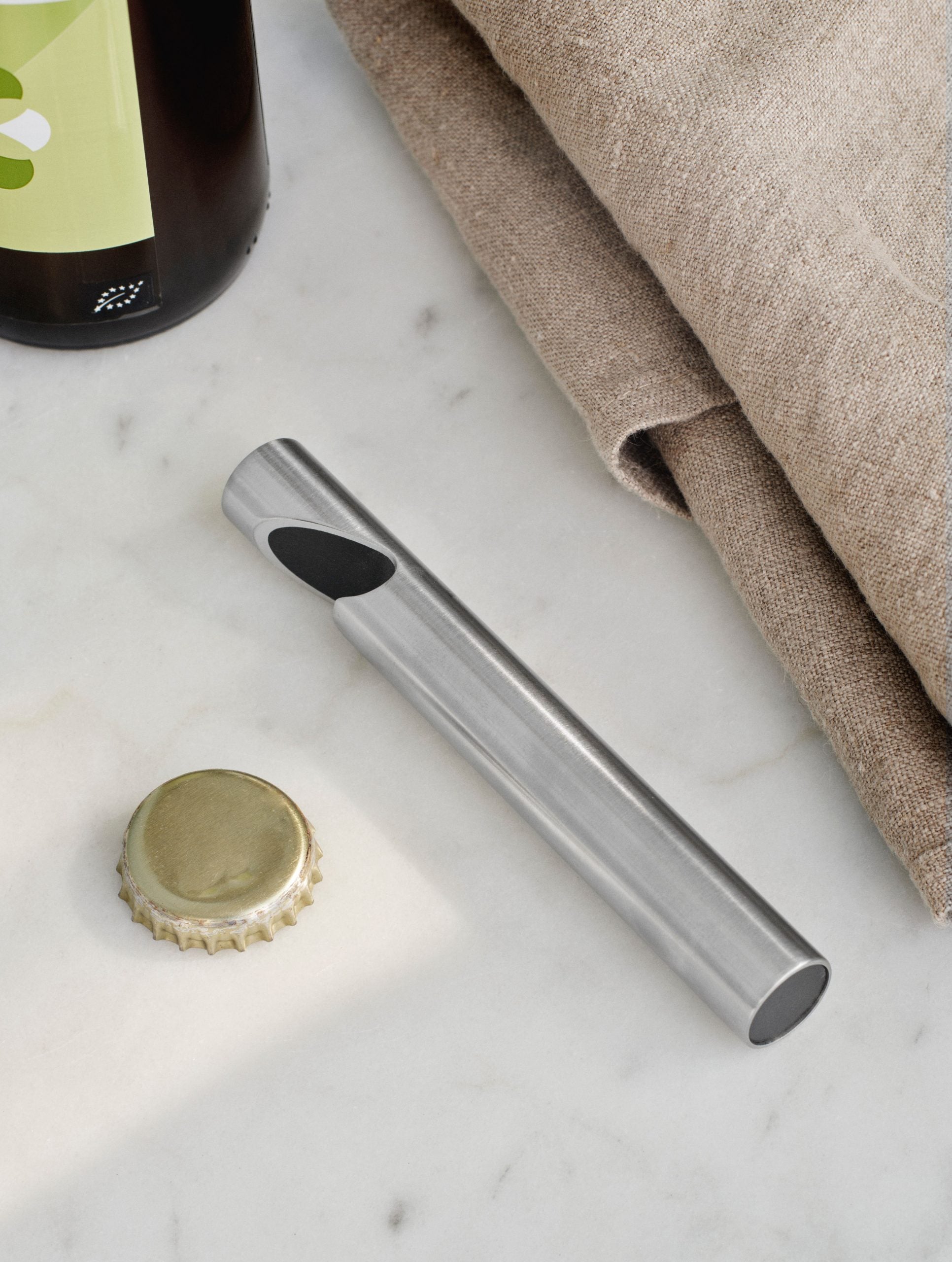 The cylindrical form, which is known from many of Stelton’s other products, is also a characteristic feature of the bottle opener designed by Peter Holmblad.