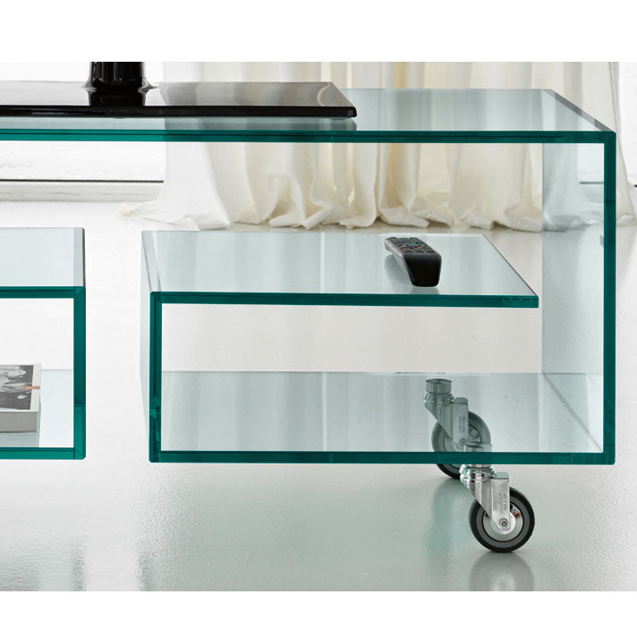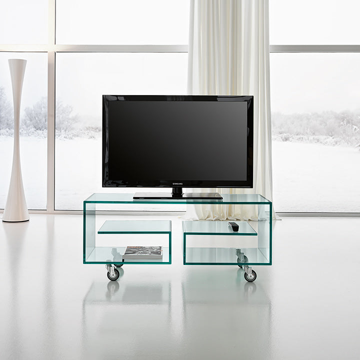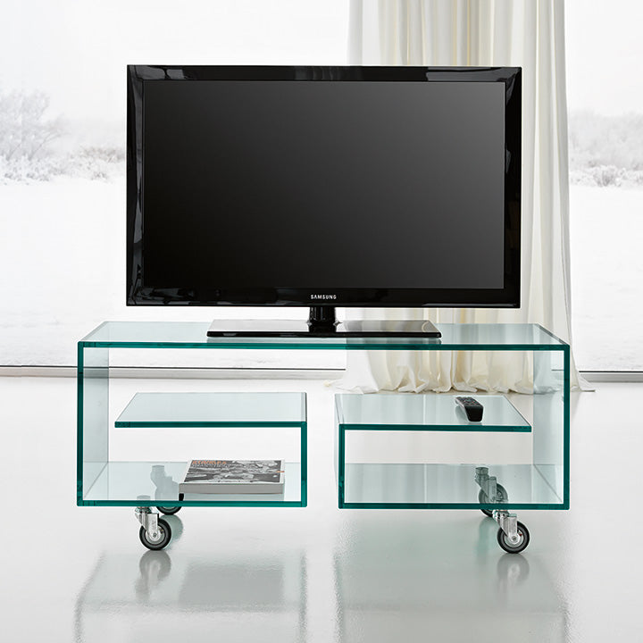 The TV stand Flo 1, furniture developed by designer Isao Hosoe, features a glass structure, transparent or extra clear, with castors under the base that make it practical and handy.