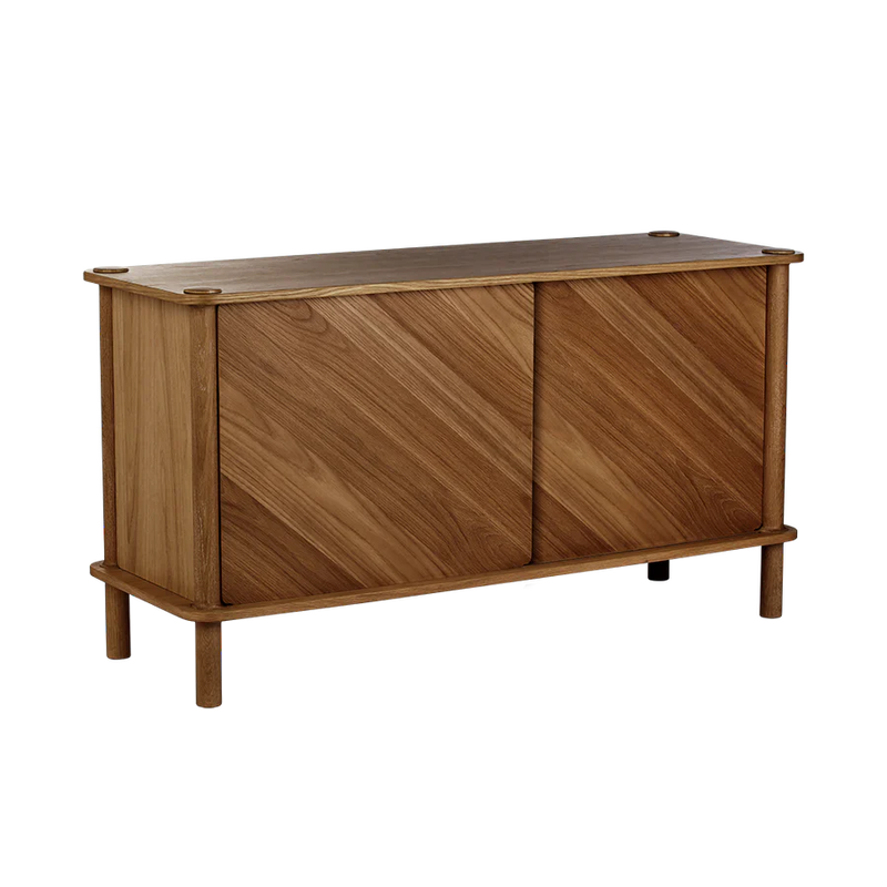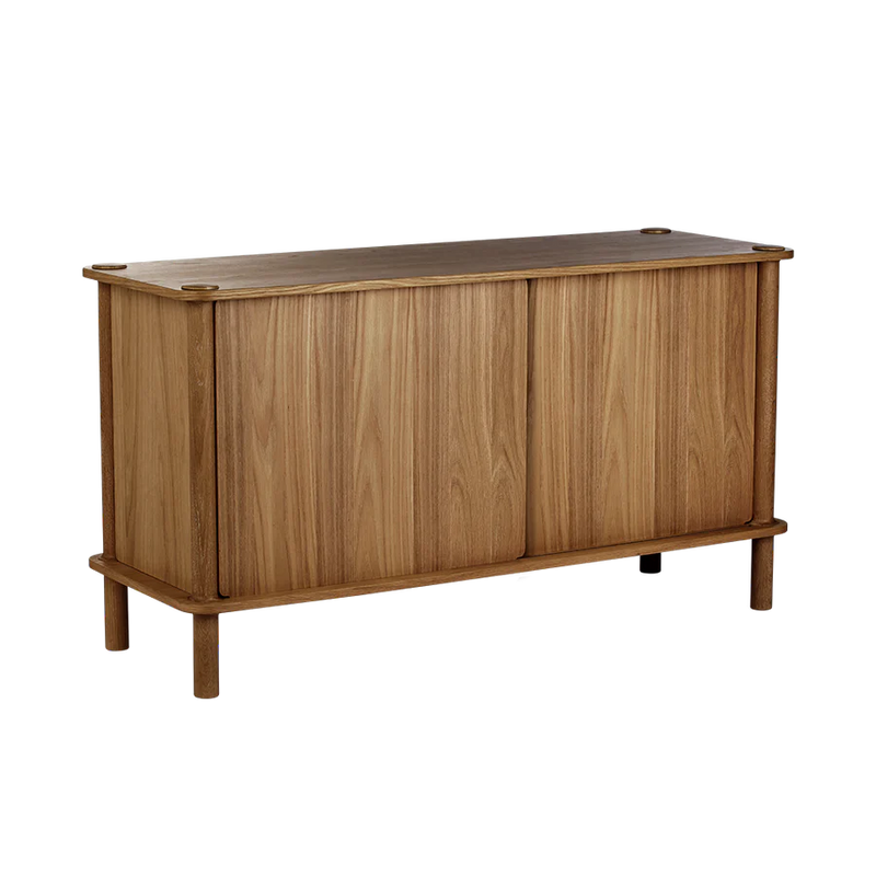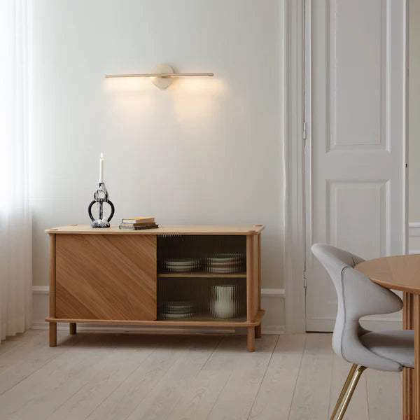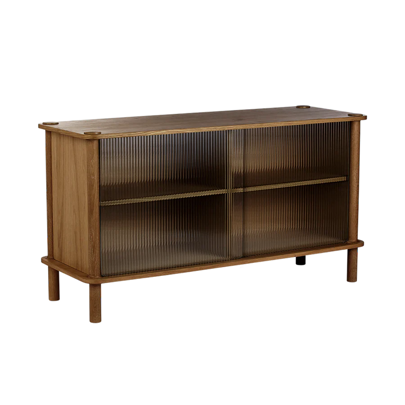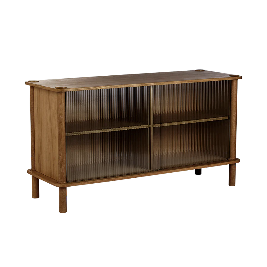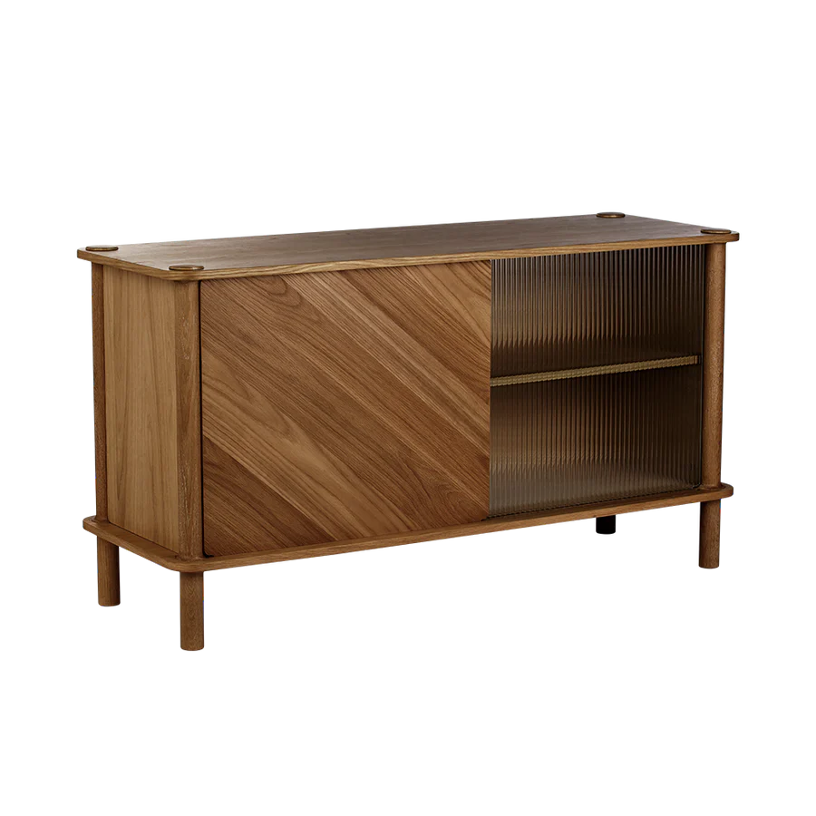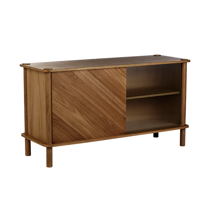 Offering sideboard doors in fluted glass or oak, the sideboard allows you to personalize and elevate your interior space. The doors can be mixed and matched to ensure an expression that fits all settings. The wooden doors have two sides: One side with a diagonal veneered panel for a unique look and one side with vertical veneer for a timeless appeal.