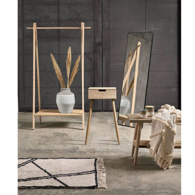 American oak bench. Assembly instructions, screws and Allen key supplied. The furniture is bleached, i.e. treated with soap containing a white pigment. Cleaning: Wipe the wood with a soft, dry cloth or one soaked in soapy water and wrung out well. For a more thorough cleaning, use a suitable wood cleaner or a mild soapy water solution. Remove excess water and soap residue immediately with a dry cloth so that the wood does not remain damp for too long.