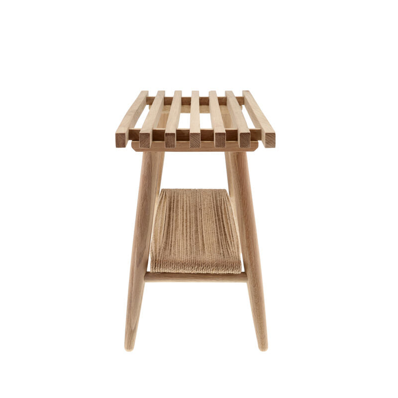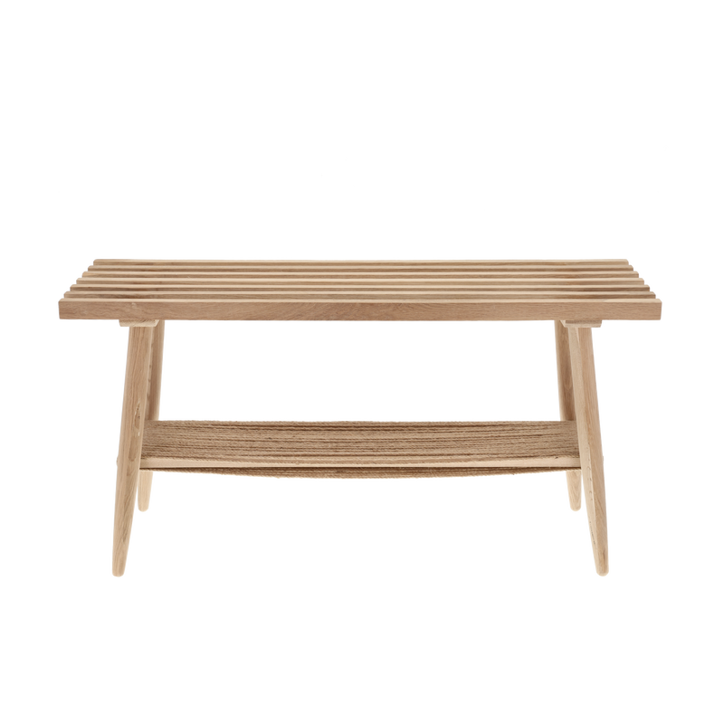 Oak bench with a modern and minimalist design that fits perfectly into most interiors. This bench offers many possibilities of use and can be used, for example, as a seat in an entrance hall or as a beautiful piece of furniture in a bedroom. Under the seat of the bench there is a small practical shelf that can be used to store small items. Maximum load 100 kg. The product is made of FSC® certified oak (FSC-C166612).