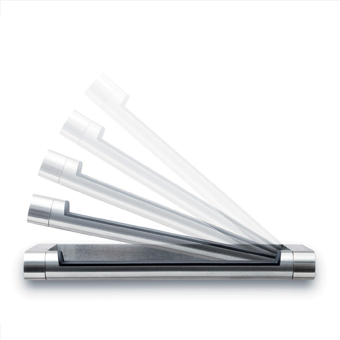 An industrial design object in genuine materials. Stainless steel, two-component plastic.