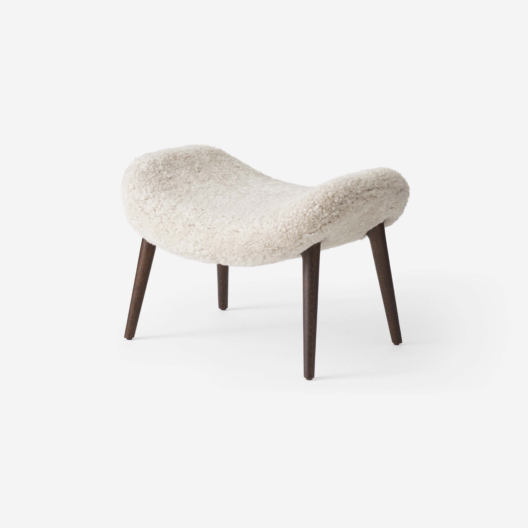 The shell of the Lodge footstool can be customised in Vipp's entire upholstery range. Here shown in predefined variants with dark oak or light oak legs.