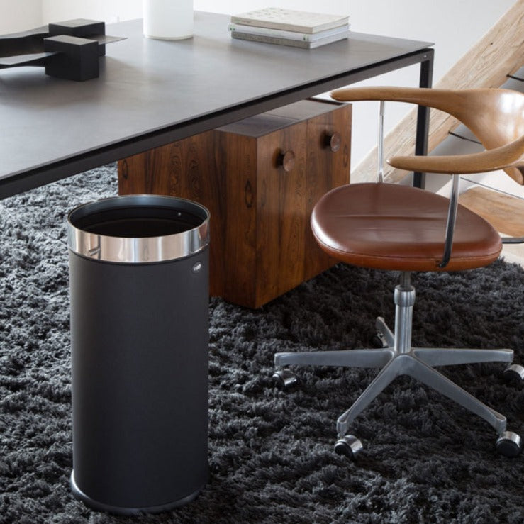 The Vipp 52 Office Bin on Wheels, Black. Holger Nielsen designed the Vipp Office Line. Originally the bins were a special order for the department store Illums Bolighus in Copenhagen, which had ordered office bins on wheels in three sizes for their office and stores. One of the bins, the medium-sized one, is still in production.