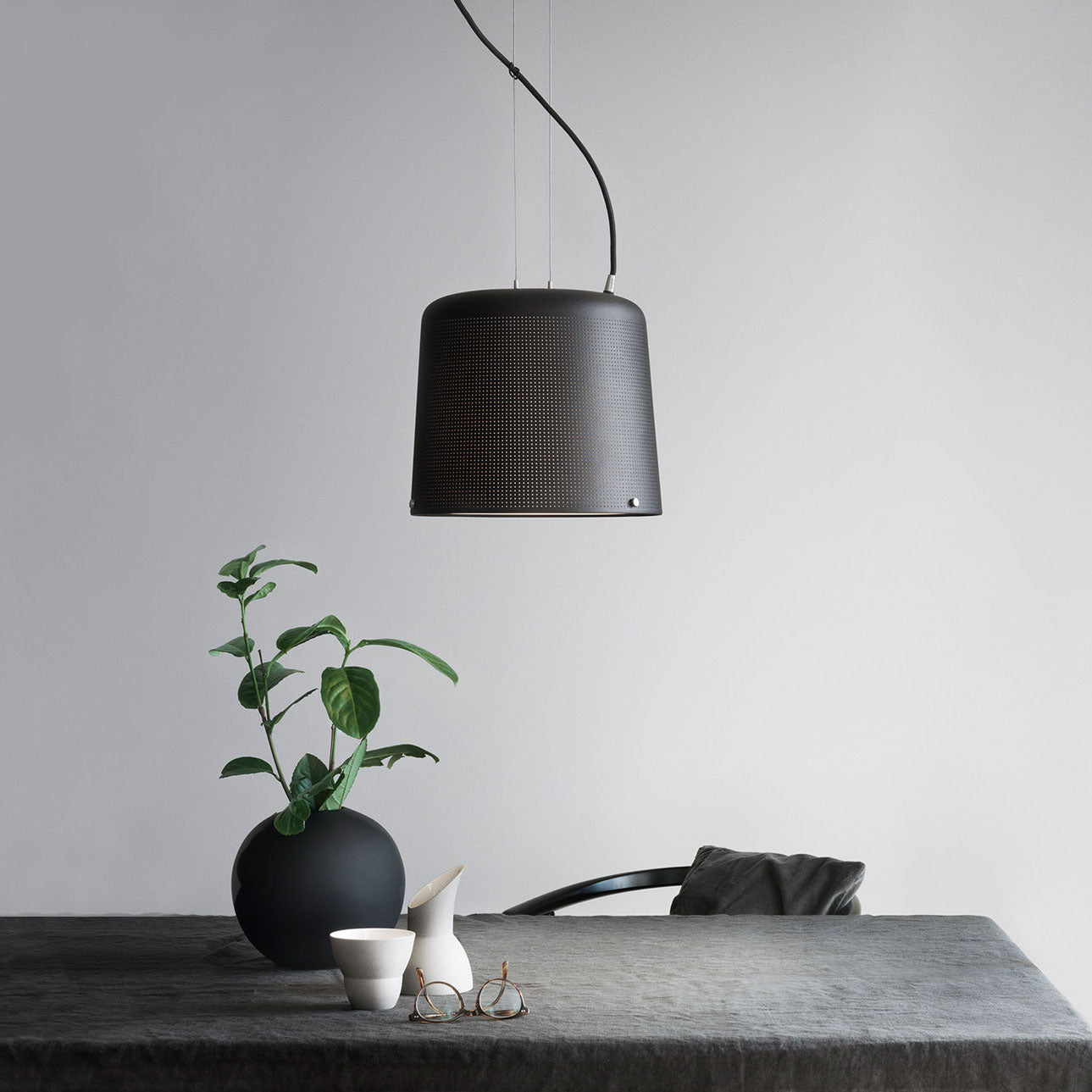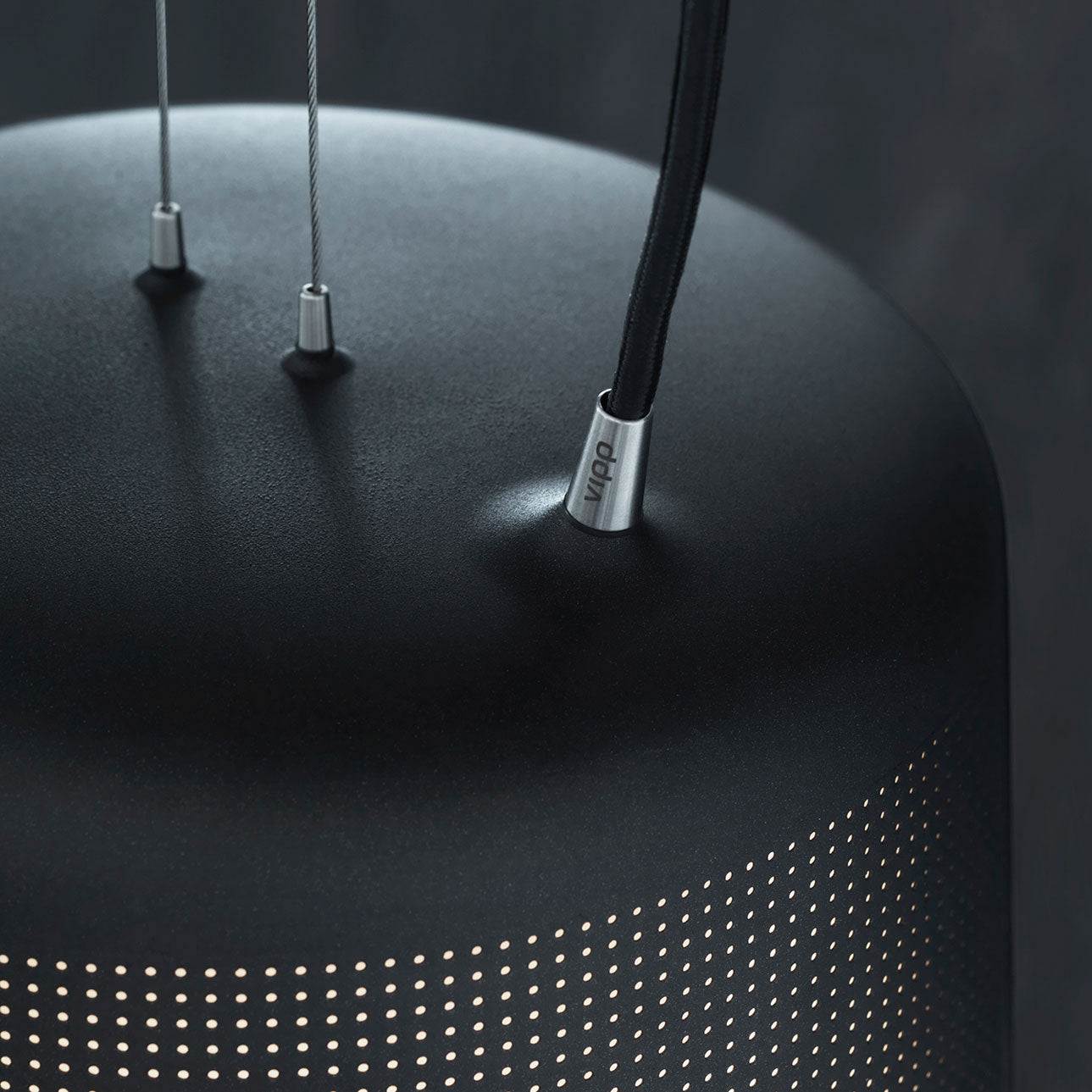 3997 perforations in the lamp shade of the Vipp pendant allow multiple rays of light to shine through the dark surface.