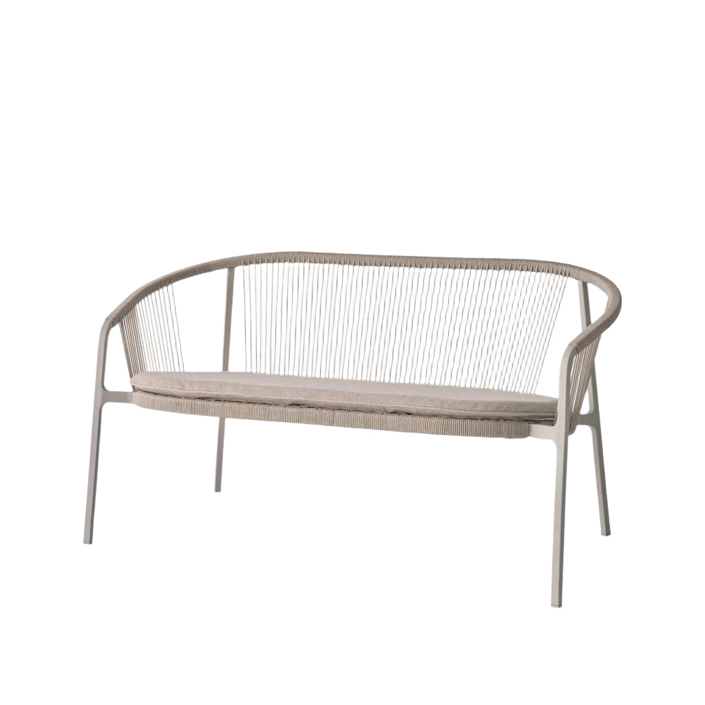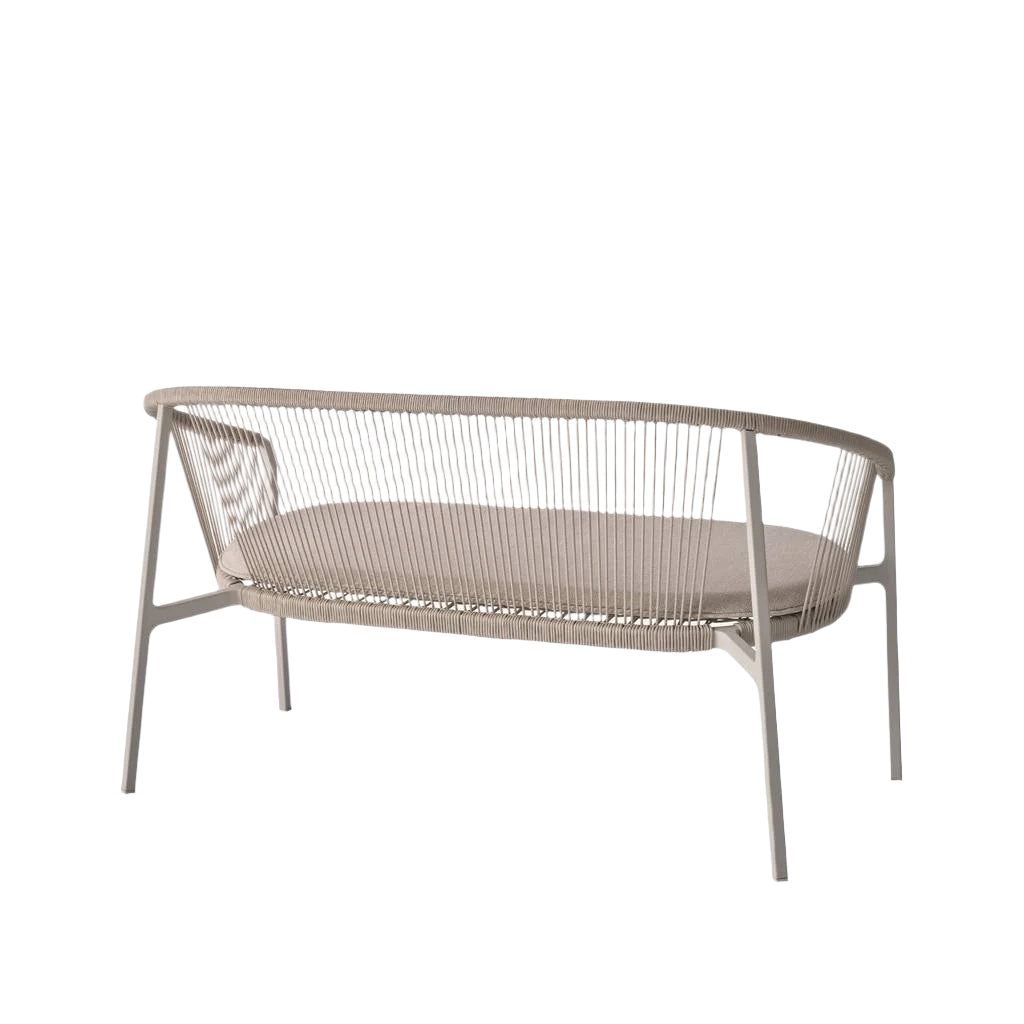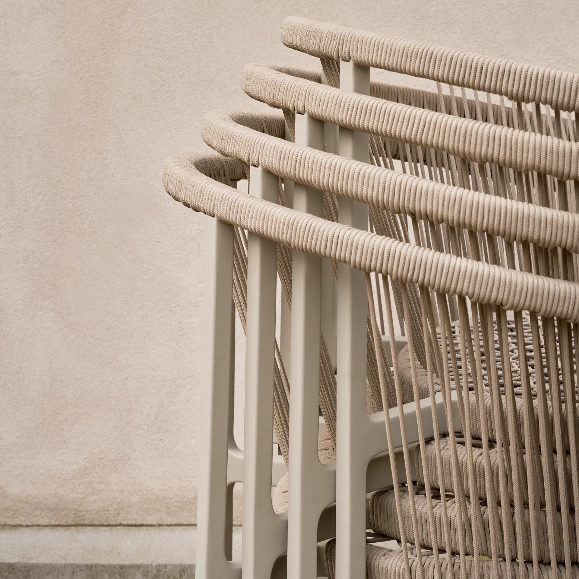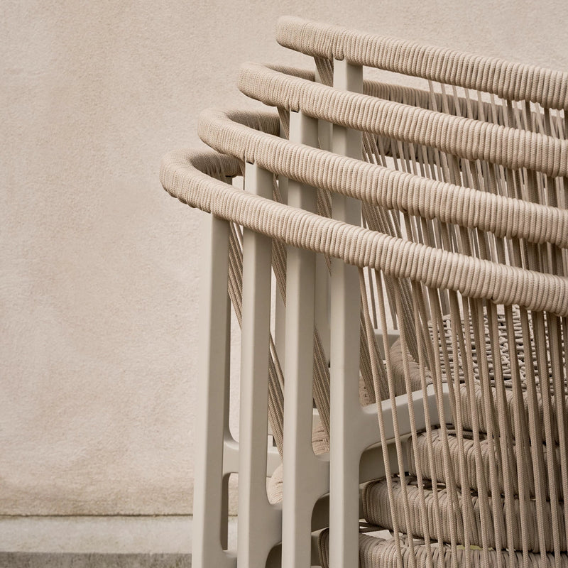 A curved backrest extends to form the armrests, wrapped in woven cord to enhance the collection’s light expression. The cord offers a comfortable, supportive seat while seamlessly blending style and function.