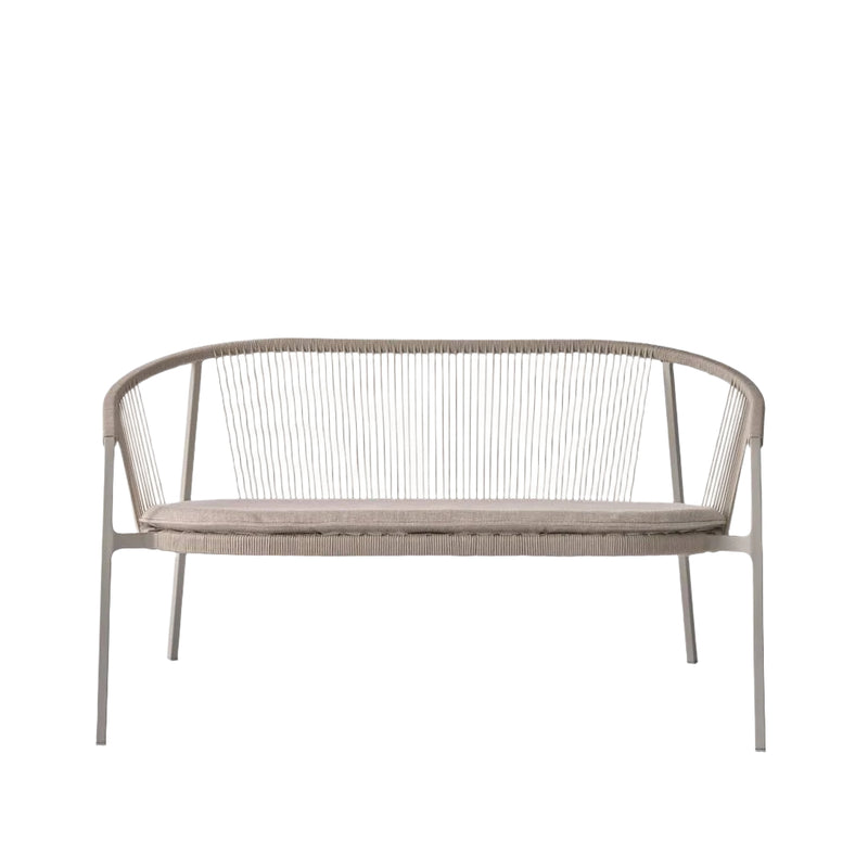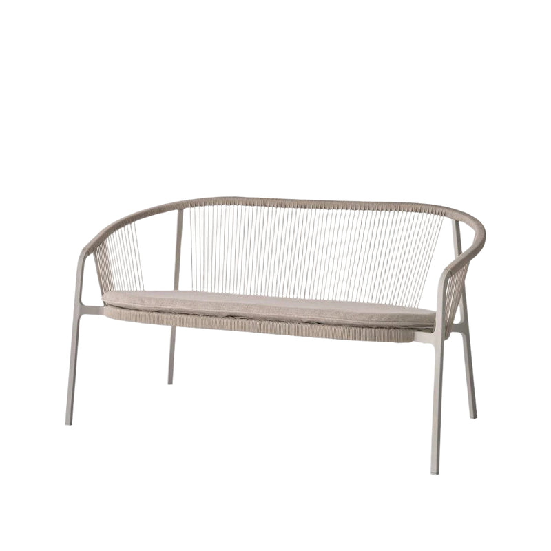 The two-seater stackable design allows for easy storage, accommodating up to four sofas. For enhanced comfort, optional cushions in durable, weather-resistant textile is available.