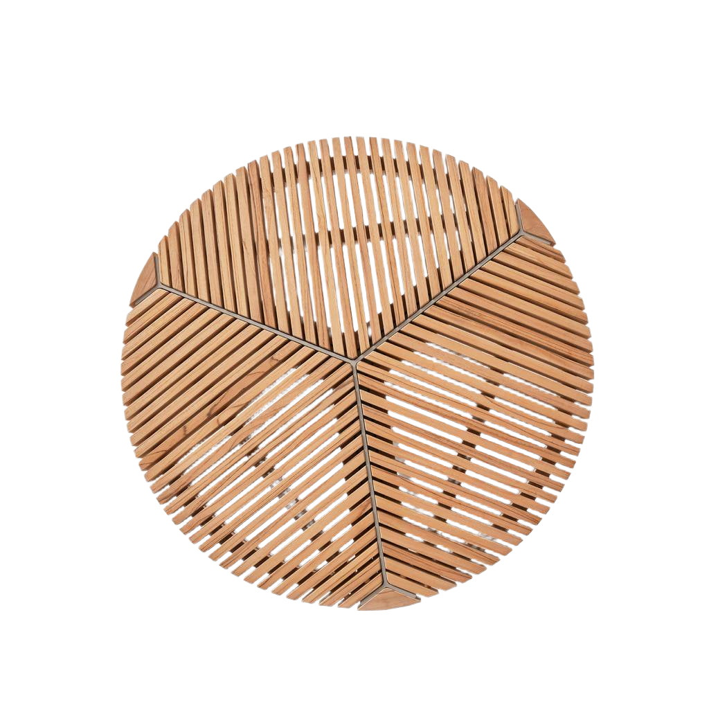 Slim teak lamellas placed in a graphic pattern make up the tabletop covering a four-legged base made of powder-coated aluminium.