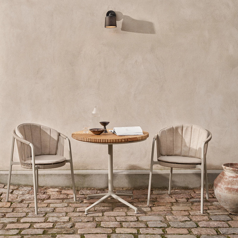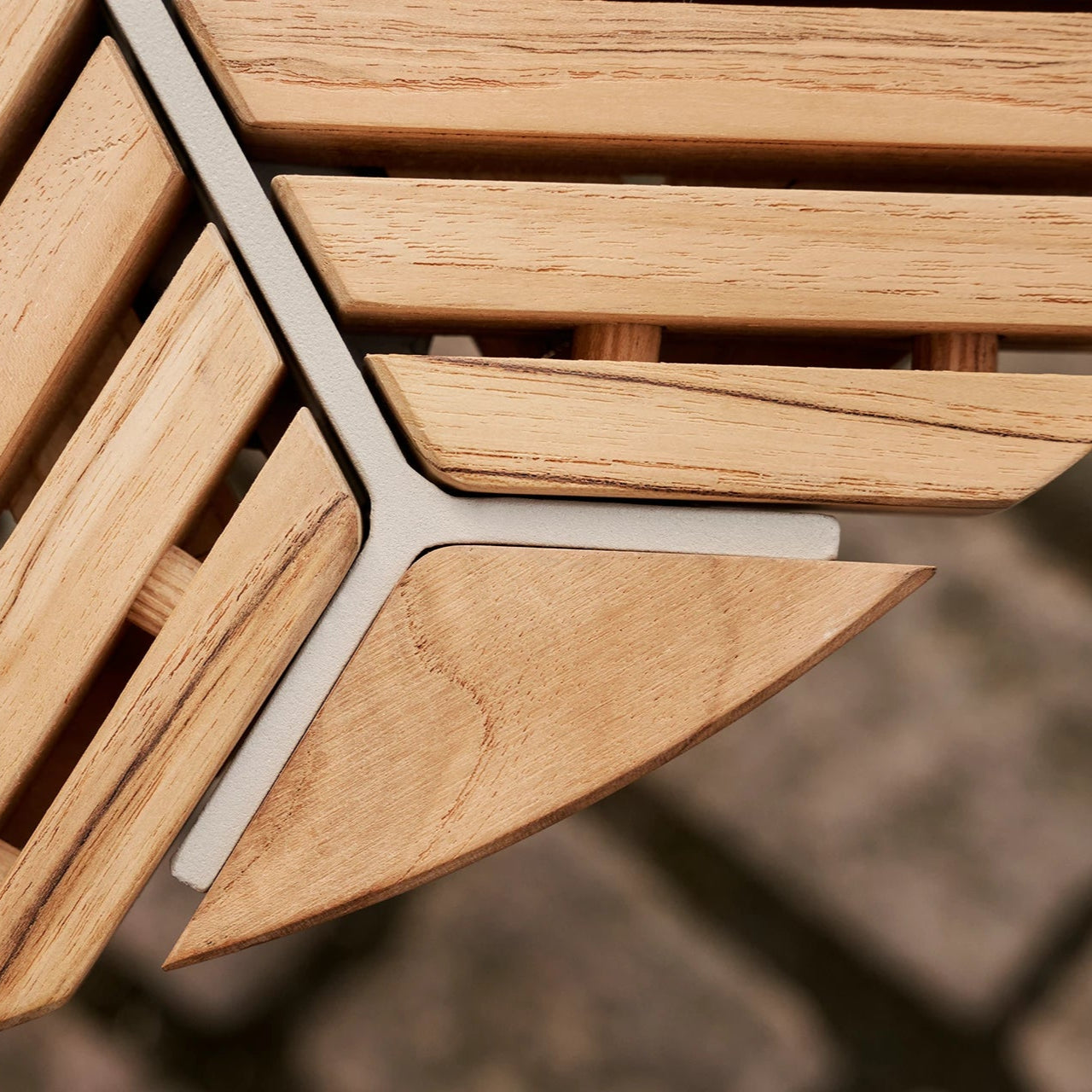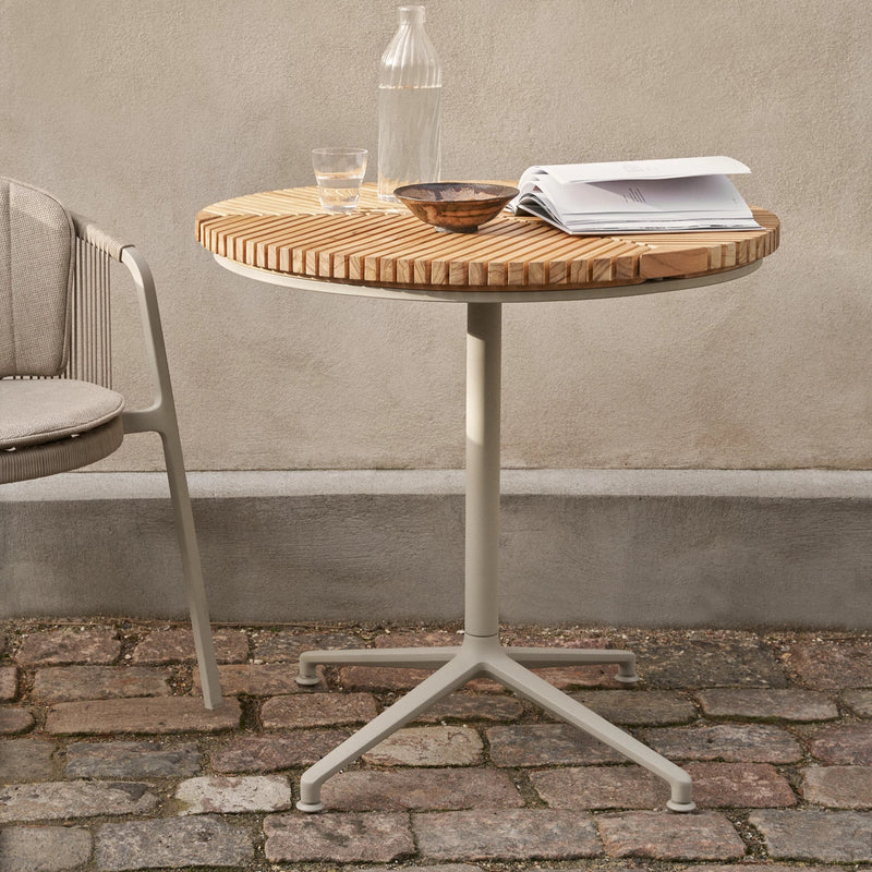 Mirroring the tabletop design of the Open-Air coffee table, slim teak lamellas are repeated in the Open-Air café table. Placed atop a four-legged base made of powder-coated aluminium, both materials are selected for their durability and resistance to outdoor conditions.