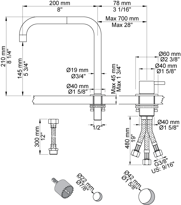 Hole cut out size, spout: 22 mm.