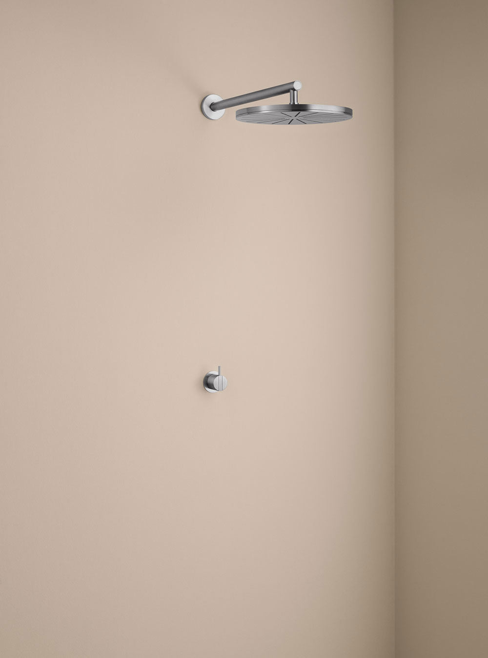 The Vola Head Shower w Mixer 2261A is available in brushed stainless steel, high polished chrome, brushed chrome, natural brass and 14 bright colours for the Vola Arne Jacobsen KV1 Kitchen Mixer.