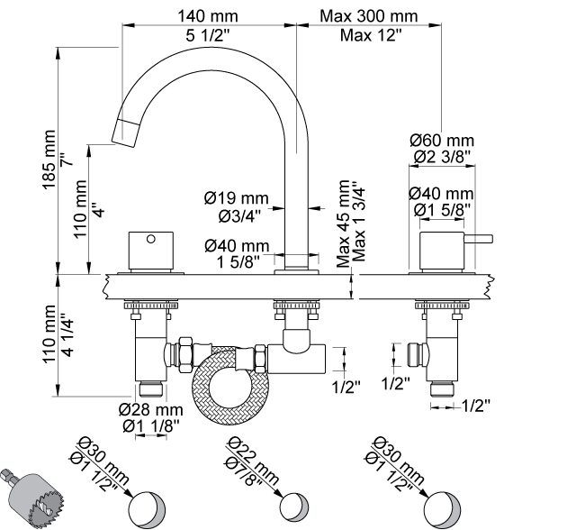 Hole cut out size, spout: 22 mm