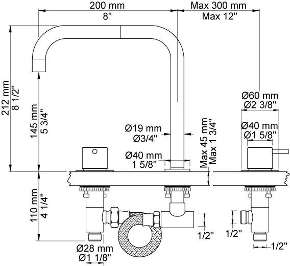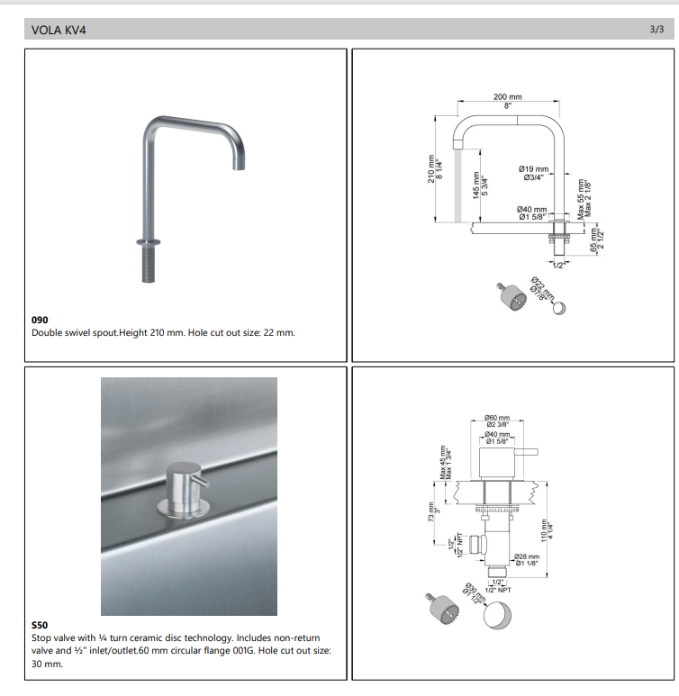 Hole cut out size, spout: 22 mm.